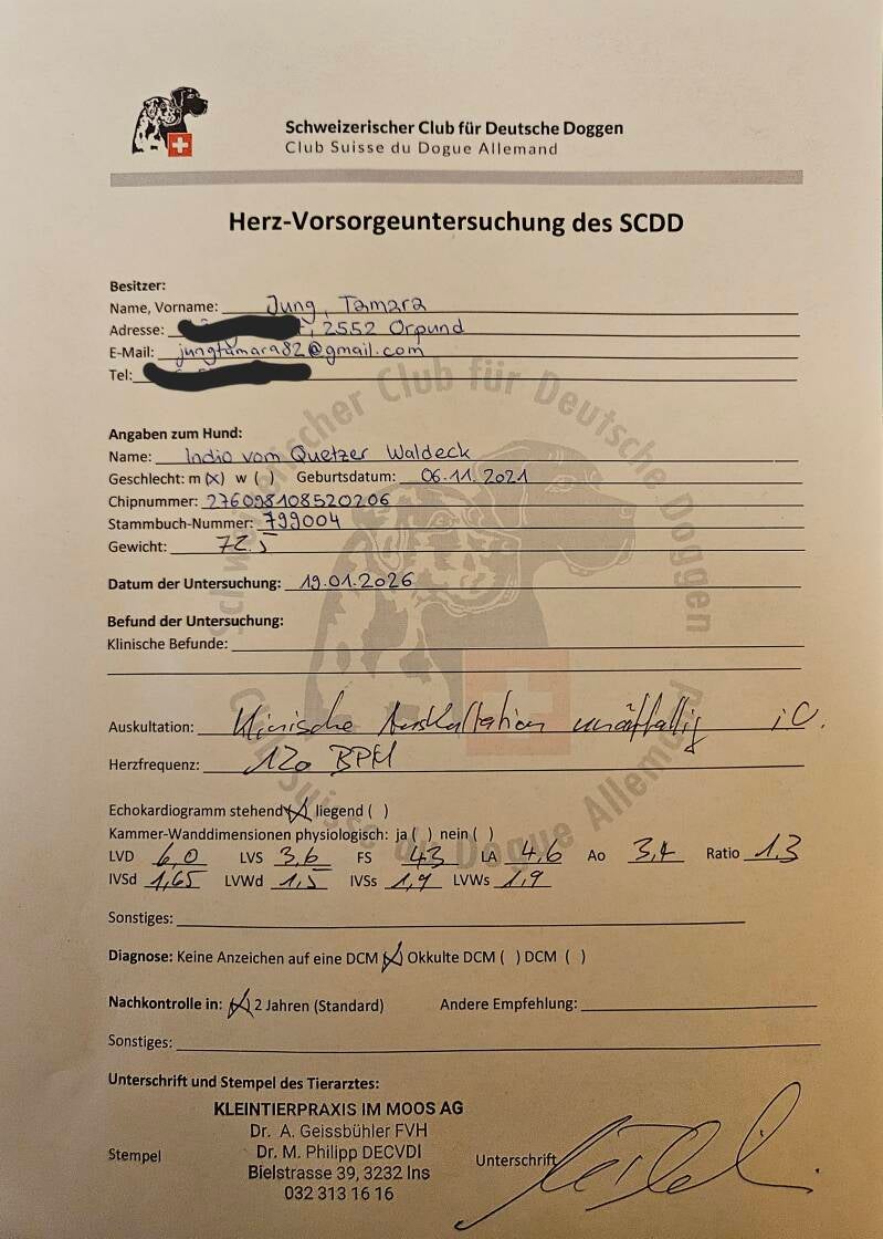19.1.2026 Da Indio bald wieder decken darf, haben wir seinen Herzultraschall ein paar Monate vorgezogen. Sein Herz ist zum Glück super, keine Anzeichen auf DCM oder andere Herzkrankheiten. Juppie! 🙃